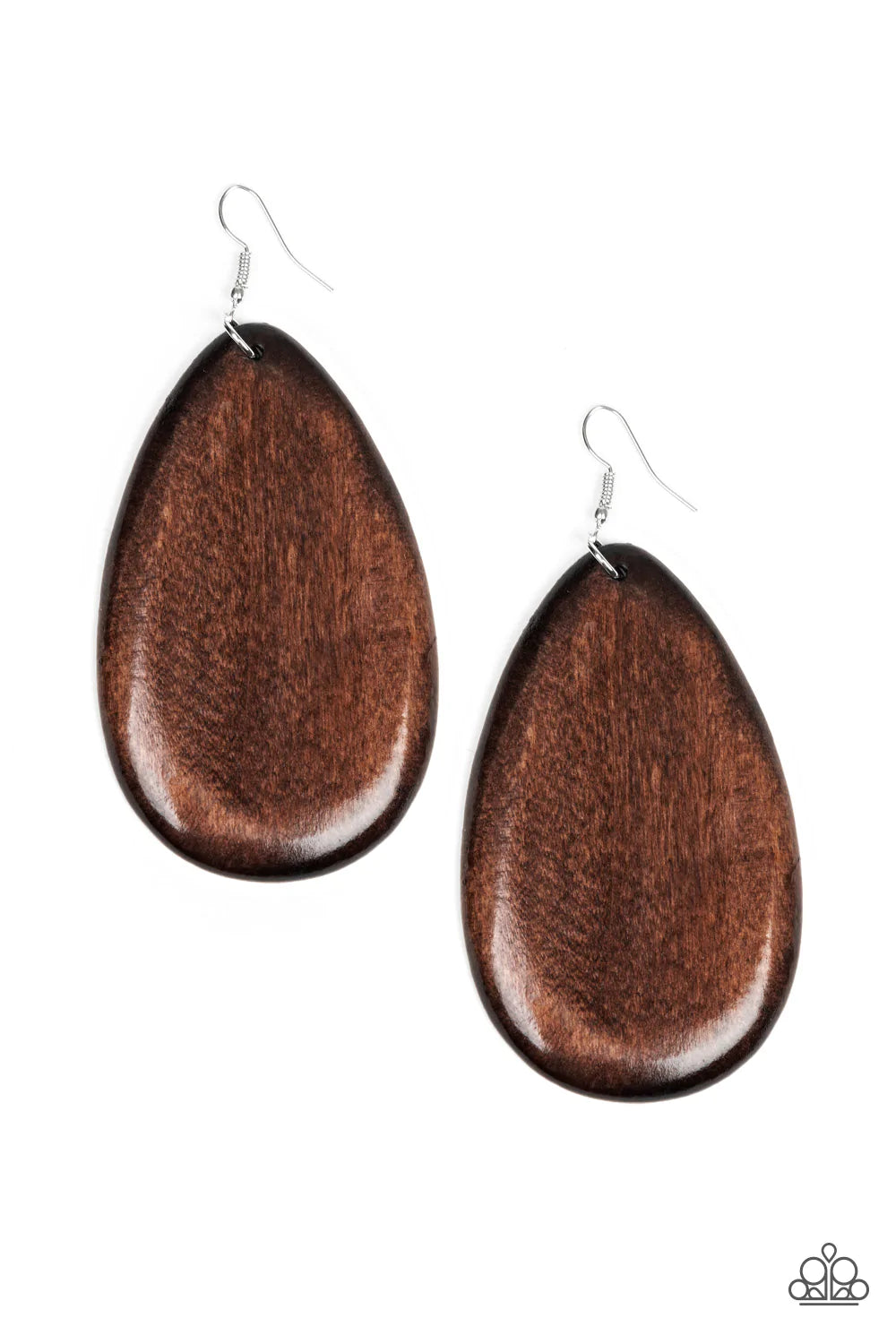 Brushed in a shiny finish, a brown wooden teardrop frame swings from the ear for a seasonal flair. Earring attaches to a standard fishhook fitting.