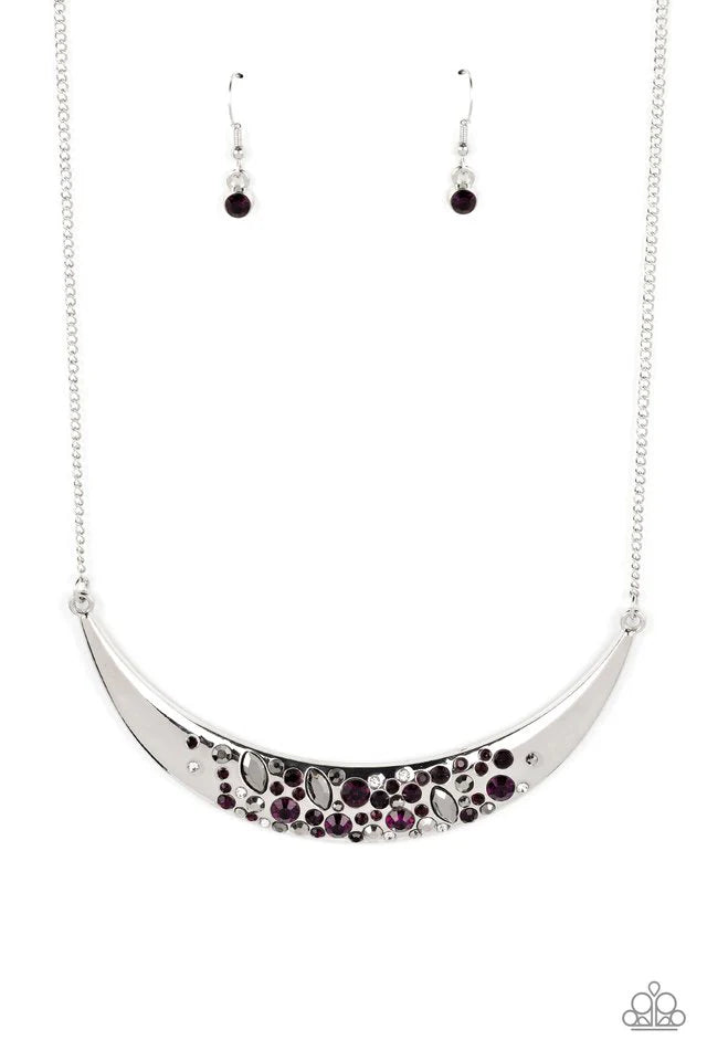 Adorn yourself with a captivating array of round purplegems and smoky stones, complemented by delicate white rhinestones and elegant marquise cut hematite. This exquisite treasure glistens on a lustrous silvercrescent, cascading gracefully just beneath the collar for a breathtaking effect. The design is completed with a convenient adjustable clasp closure, ensuring a perfect fit for any occasion.