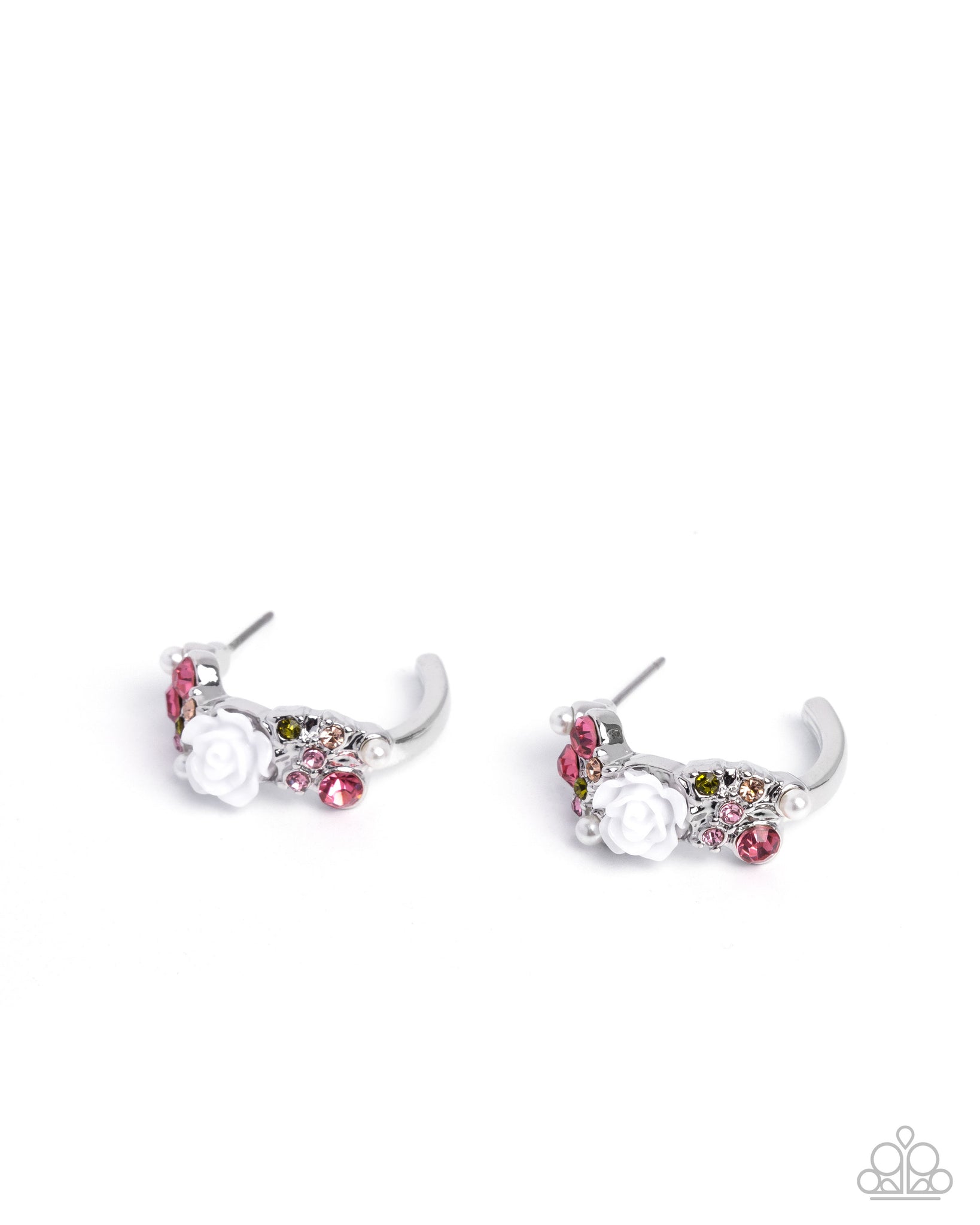 A dainty white resin rose is encased by shimmering pink and olive green rhinestones, creating a whimsical floral motif. The intricate detailing is accented with lustrous pearls, adding a vintage-inspired elegance. Earring attaches to a standard post fitting. Hoop measures approximately 1" in diameter.