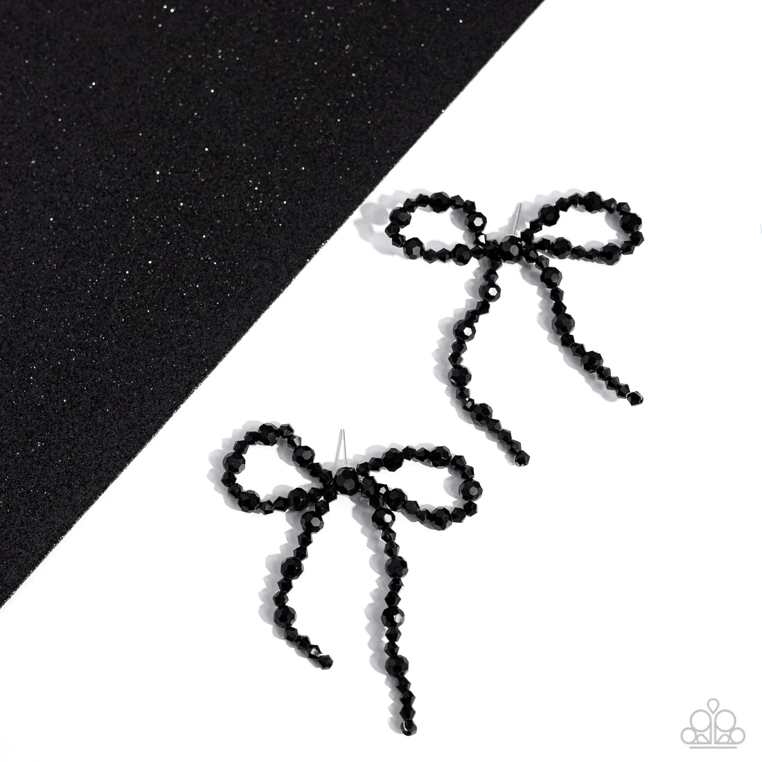 Infused along an invisible wire, faceted black high-sheen beads curl and loop into a stunning bow, creating a classy statement at the ear. Earring attaches to a standard post fitting.