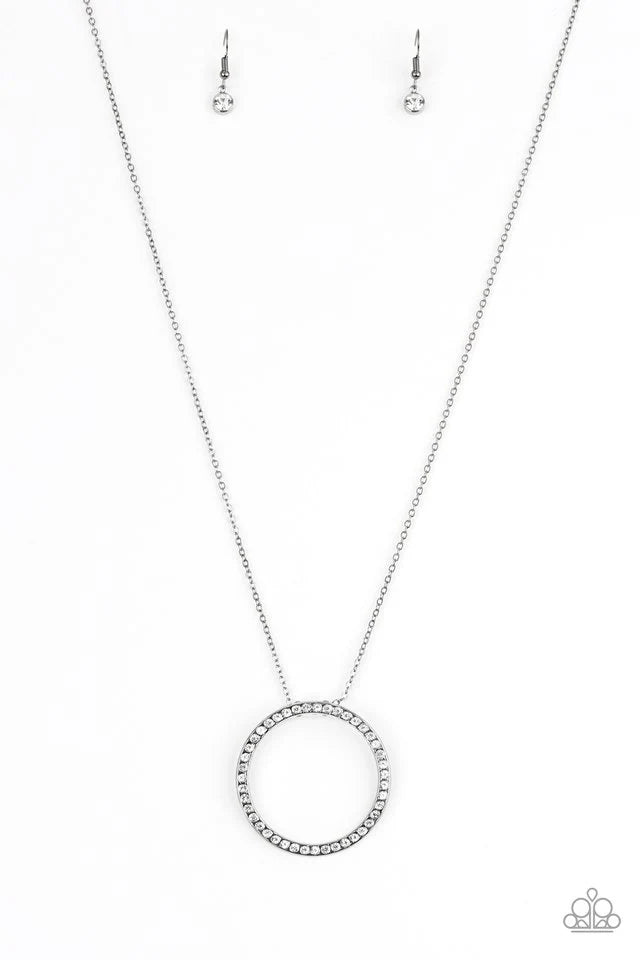 Encrusted in glittery white rhinestones, a dramatic gunmetal hoop swings from the bottom of a lengthened gunmetal chain for a refined look. Features an adjustable clasp closure.