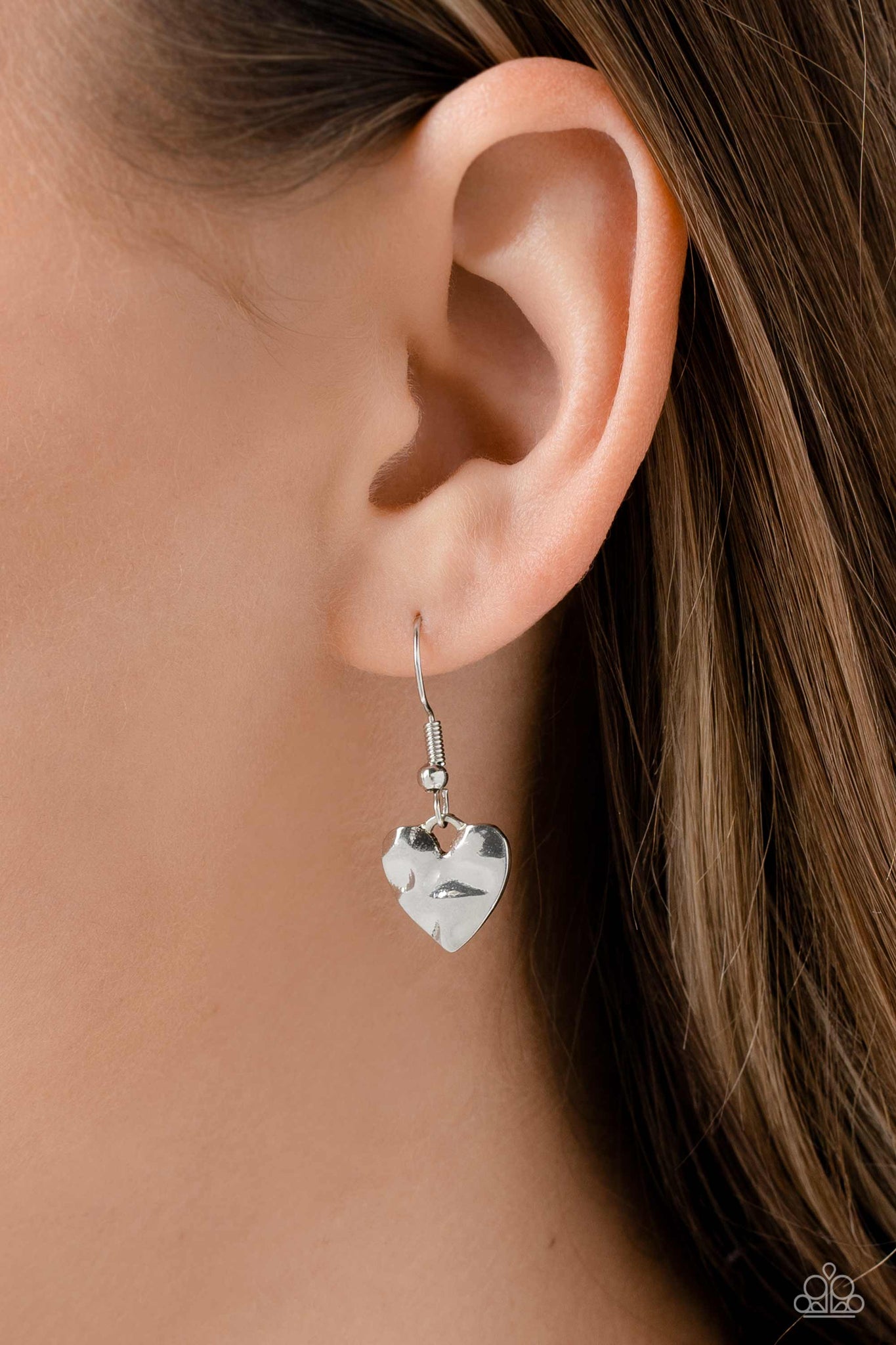 An oversized, silver heart pendant featuring a hammered sheen, falls down the neckline at the end of red cording for an alluring appeal. Features an adjustable clasp closure.