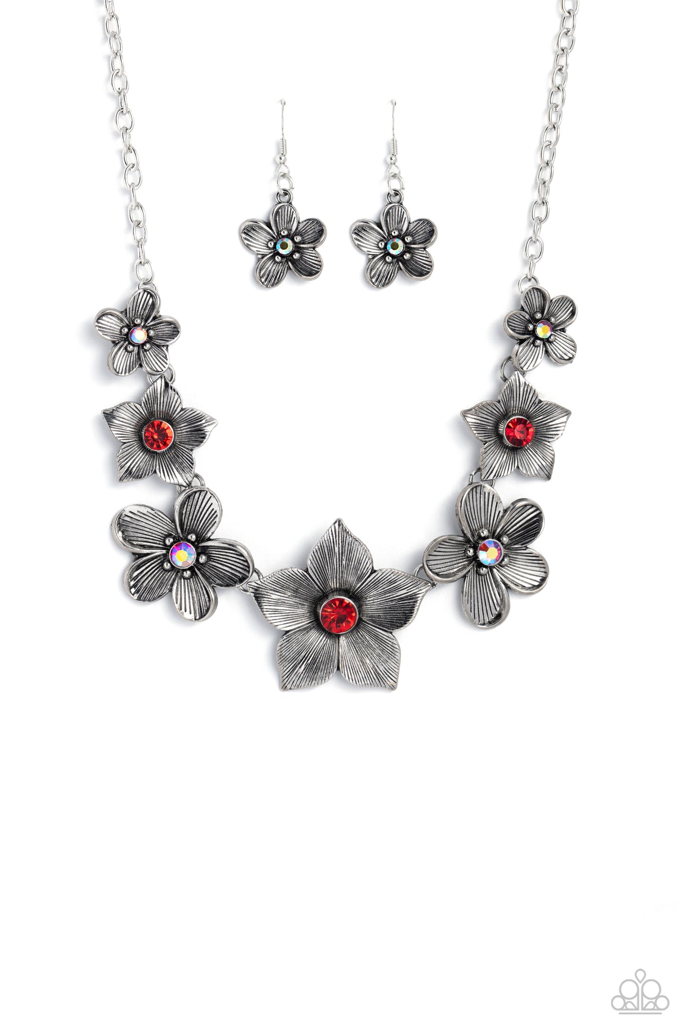 Peaked and rounded tactile silver flowers alternate as they gradually increase in size towards the center of the collar on a classic silver link chain. The rounded flowers feature iridescent red gem centers while the peaked flowers feature various red gem centers for a whimsical array of glitz. The rounded flowers also feature a border of studs around its center for a subtle industrial finish. Features an adjustable clasp closure. Due to its prismatic palette, color may vary.