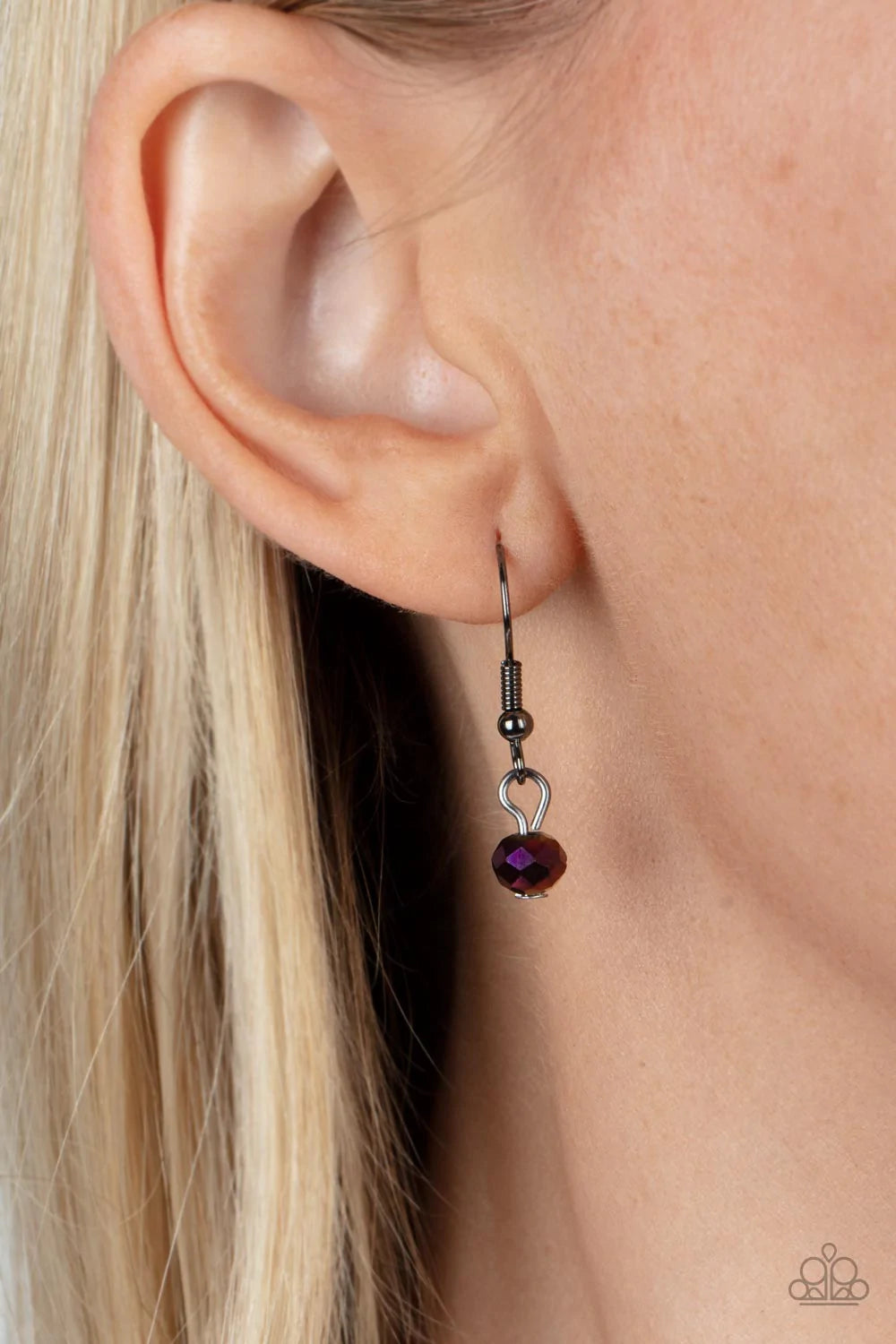 Flecked in oil spill iridescence, a faceted collection of metallic purple beads cluster along the center of a chunky gunmetal curb chain, creating a stellar fringe below the collar. Features an adjustable clasp closure.