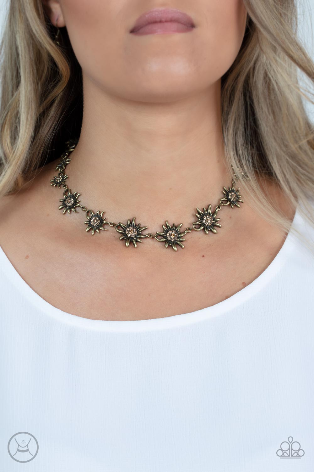 Featuring studded brass or topaz rhinestone encrusted centers, lifelike brass daisies gradually increase in size as they link around the necklace for a fashionably floral display. Features an adjustable clasp closure.