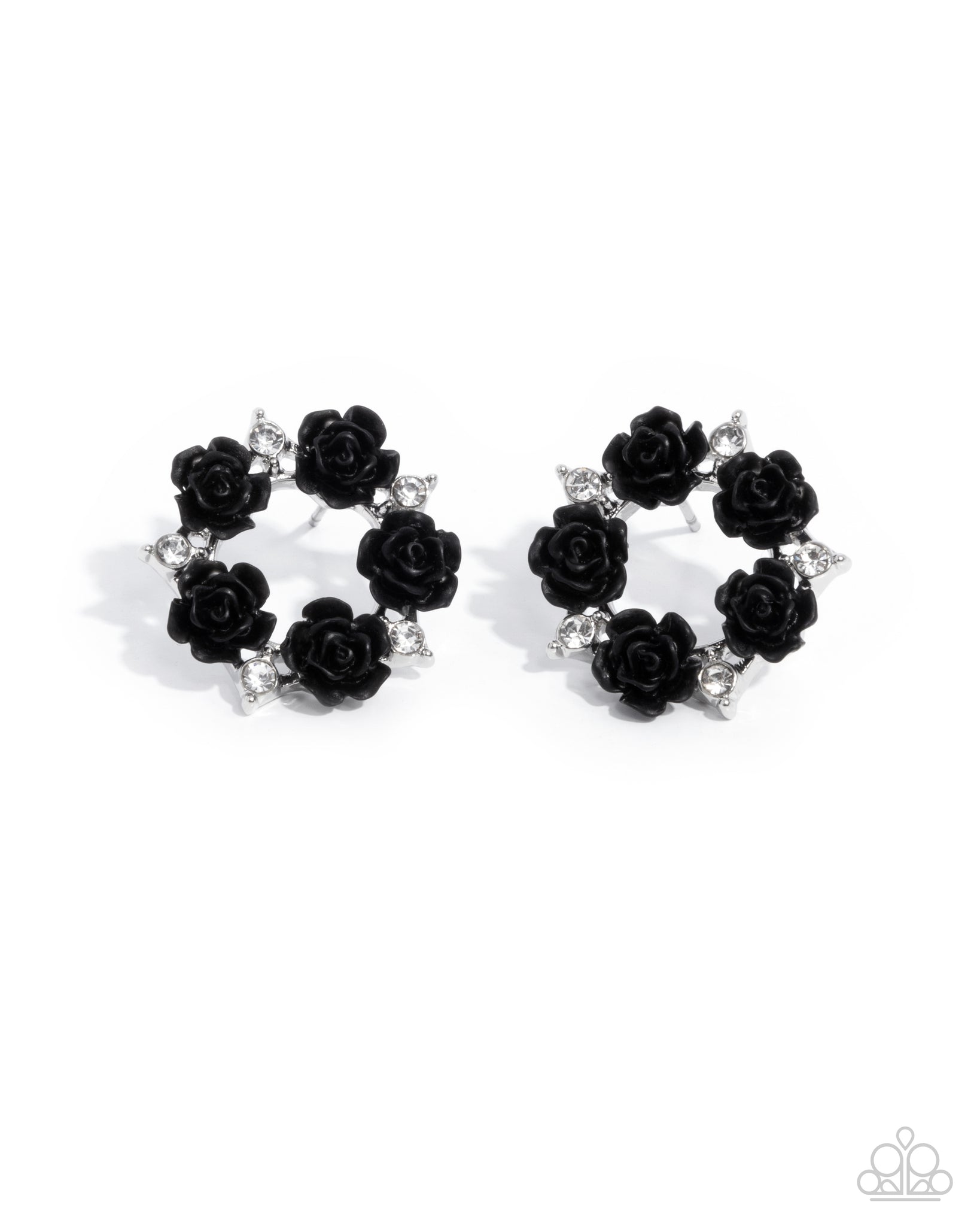Pressed in silver fittings, dainty white rhinestones alternate beside tactile black rosettes along a glistening silver ring, creating a free-spirited wreath atop the ear. Earring attaches to a standard post fitting.