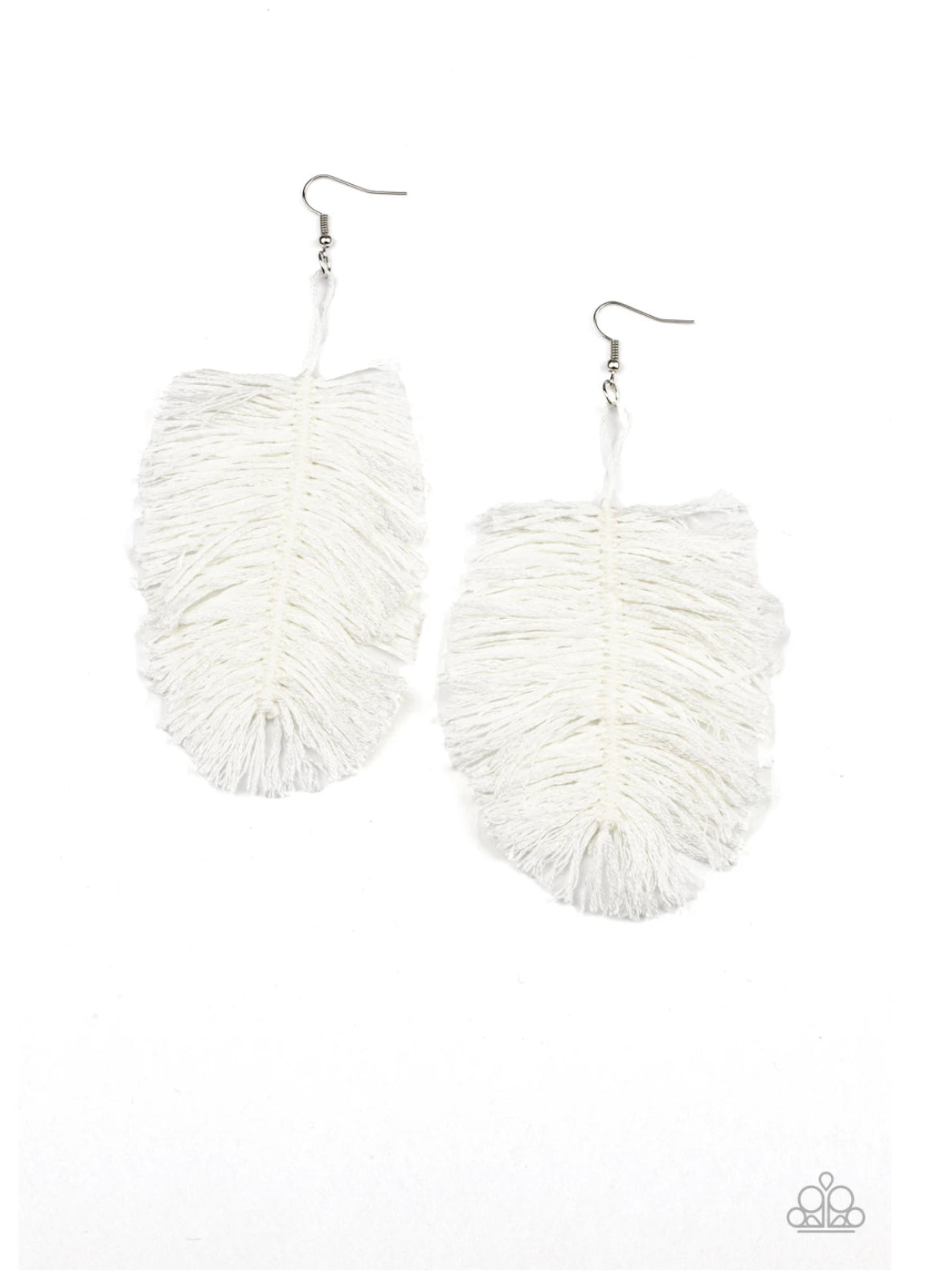 Featuring a refreshing white hue, a loop of thread gives way to a leafy white fringe, creating a statement-making texture. Earring attaches to a standard fishhook fitting.