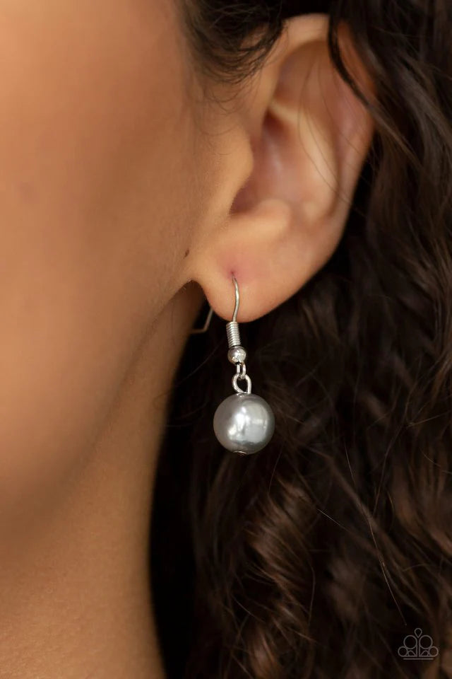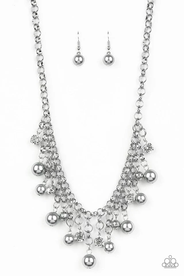 A collection of bubbly silver pearls, glittery white rhinestones, and ornate silver beads swing from the bottom of a shimmery silver chain, creating a refined fringe below the collar. Features an adjustable clasp closure. Sold as one individual necklace. Includes one pair of matching earrings.