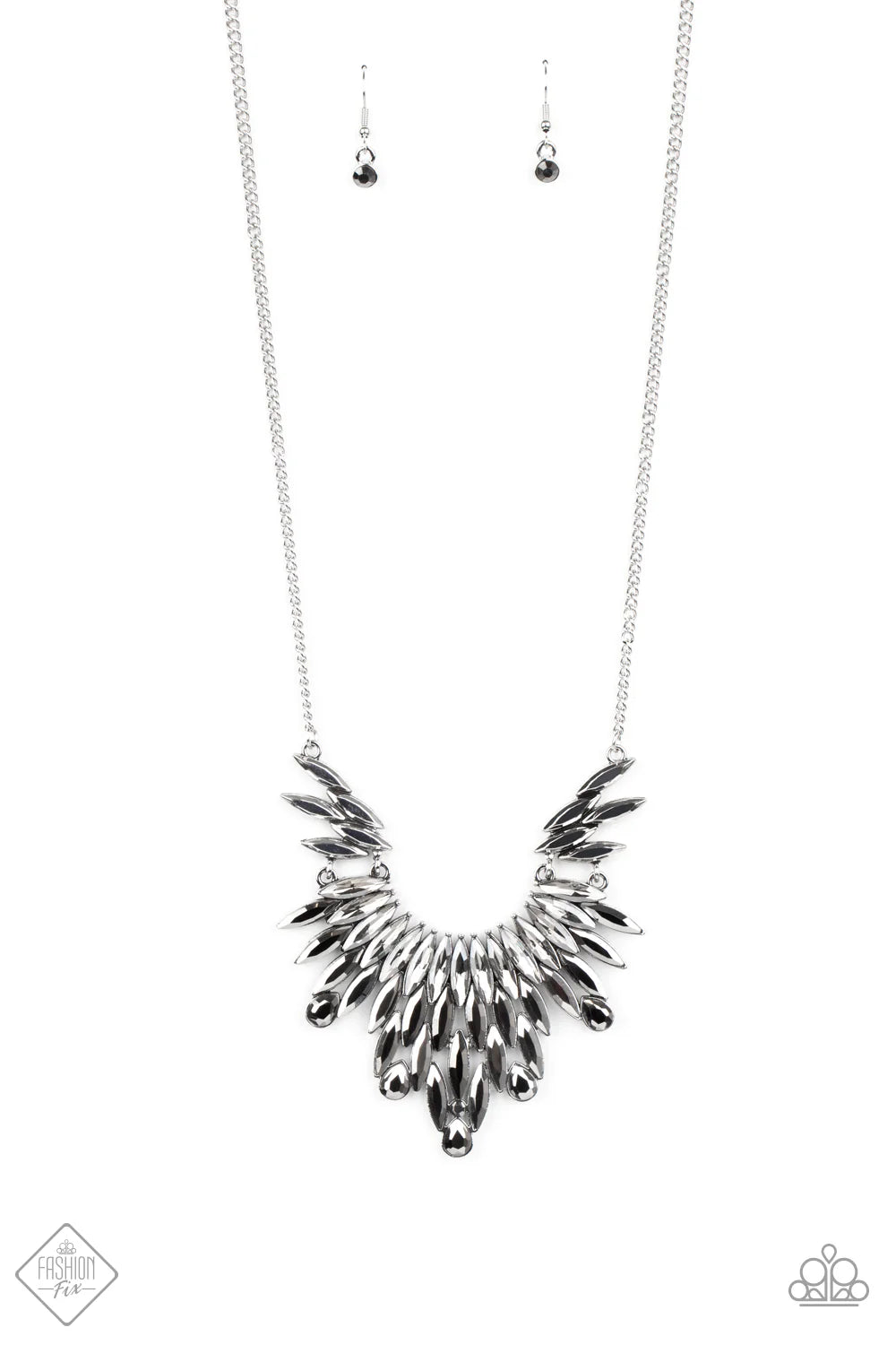 An explosion of silver, white crystal, and hematite marquise-cut rhinestones erupts into a dynamic pendant that swings boldly from a silver chain. Smoky hematite teardrops dot the bottom of the pendant, taking this smoldering display of shimmer to a whole new level. Features an adjustable clasp closure.