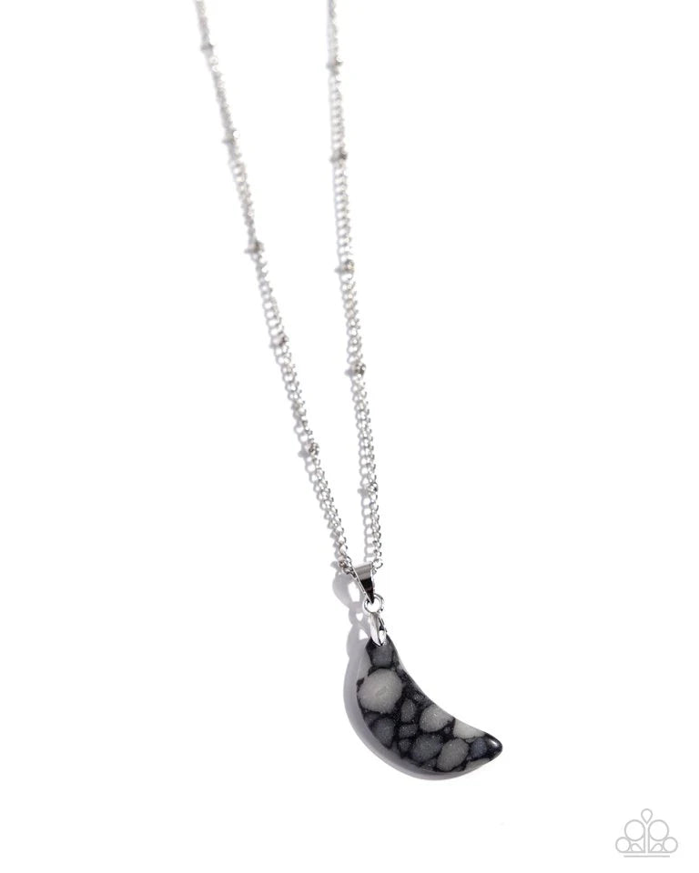 A celestial-inspired necklace showcases a black-spotted crescent moon stone gracefully suspended from a delicate silver satellite chain, creating a refined yet striking accessory for any occasion. With an adjustable clasp closure for a perfect fit, this piece embraces the beauty of nature, allowing for unique color variations in its natural stone elements, adding to its charm and individuality.