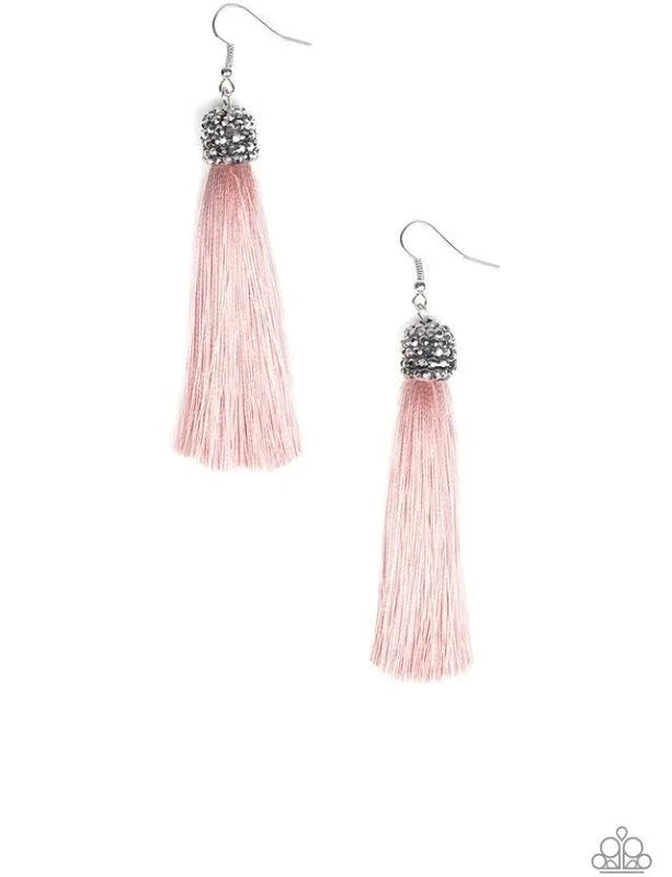 Encrusted in row after row of hematite rhinestones, a glittery gunmetal bead gives way to a plume of shiny pink thread for an elegantly tasseled look. Earring attaches to a standard fishhook fitting.Sold as one pair of earrings.