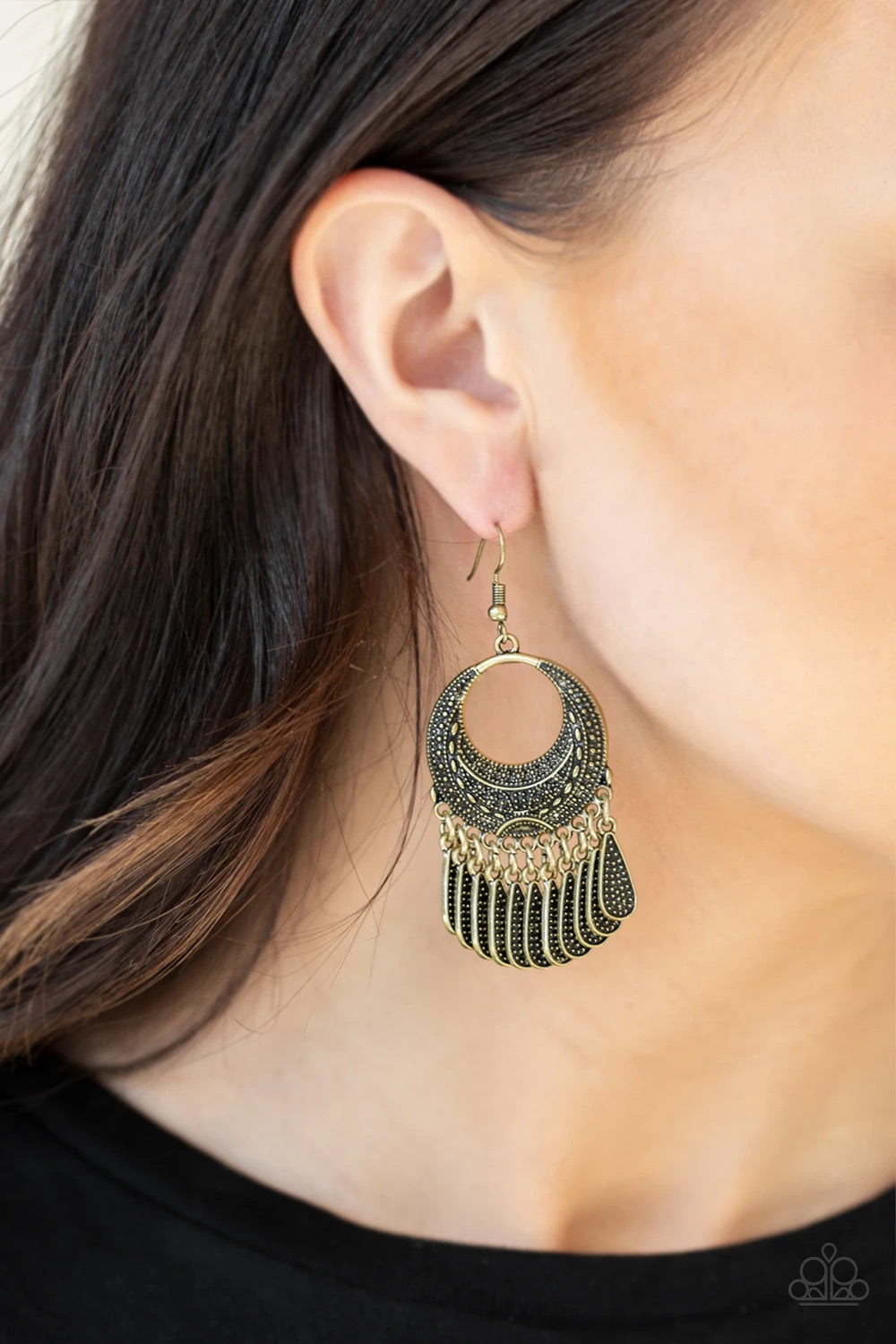 Studded brass teardrops swing from the bottom of an ornate brass hoop radiating with tribal inspired patterns for an indigenous flair. Earring attaches to a standard fishhook fitting.