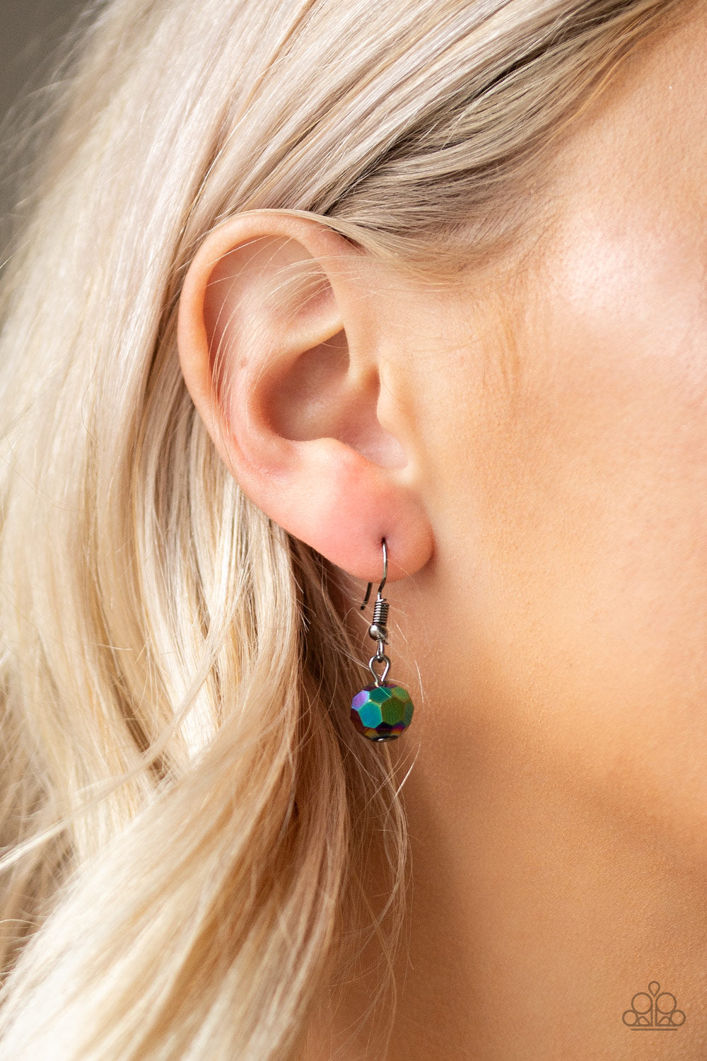 A collection of airy gunmetal beads, faceted rainbow metallic beads, and hematite rhinestone encrusted rings are threaded along an invisible wire below the collar for a statement-making fashion. Features an adjustable clasp closure.