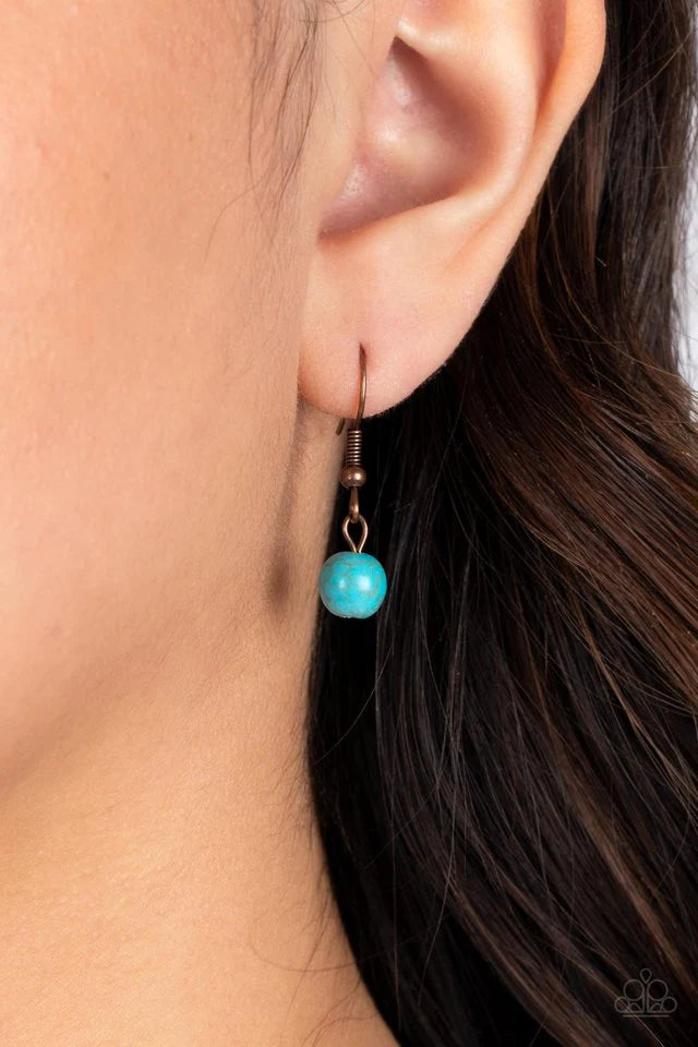 A delicate copper snake chain elegantly supports a stunning marbled turquoise stone, nestled at the heart of a beautifully crafted copper-studded frame. Artisanal etchings radiate from the stone, enhancing its unique character. As each element is derived from natural materials, slight color variations are expected, adding to its charm. The piece is completed with an adjustable clasp for a perfect fit.