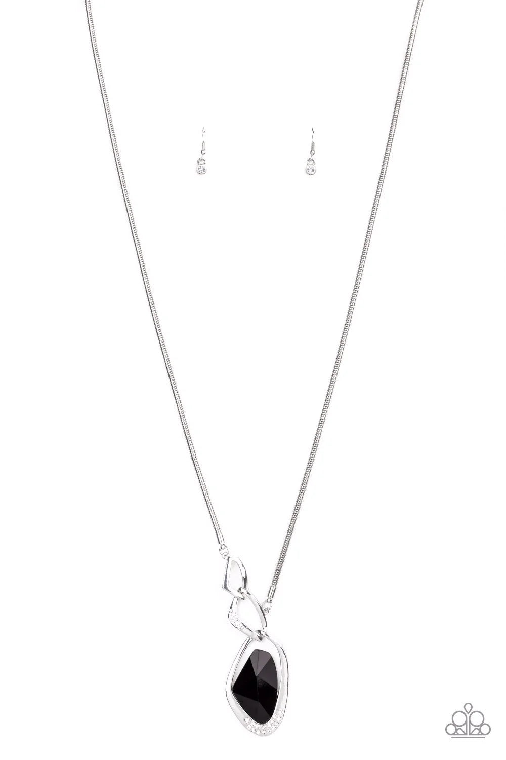 A faceted black gem is nestled inside of a shimmery silver frame encrusted in dainty white rhinestones. The glittery pendant asymmetrically links with abstract silver frames at the bottom of a lengthened silver rounded snake chain for a modern look. Features an adjustable clasp closure.