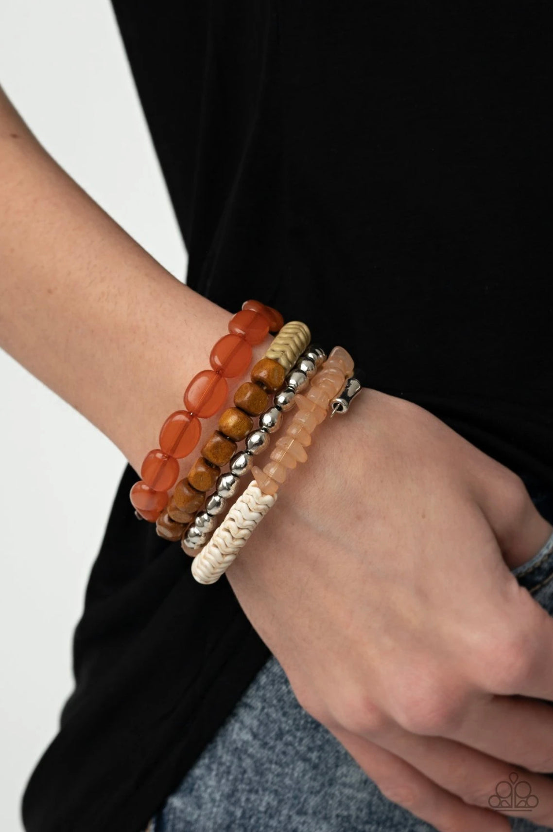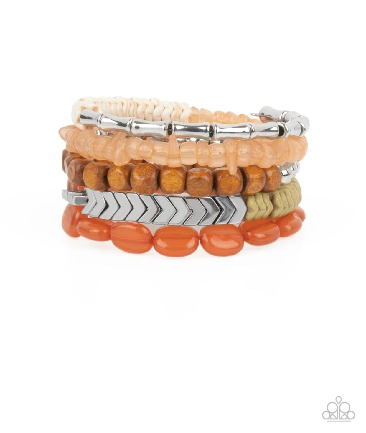 An earthy collection of wooden cubes, glassy brown ovals, wavy brown accents, orange pebble-like accents, classic silver beads and silver chevron frames are threaded along a long wire to create a whimsical infinity wrap bracelet around the wrist.