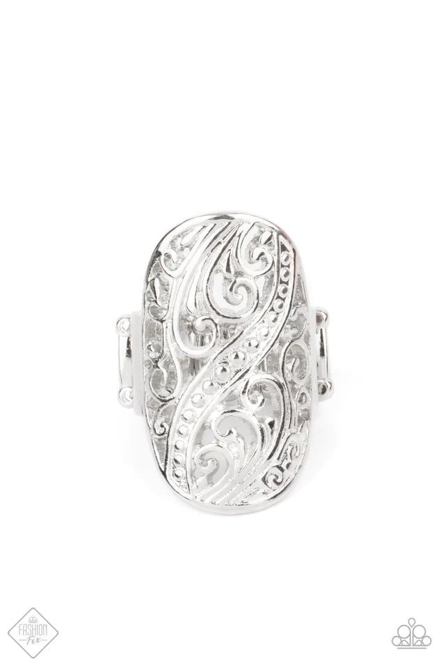 Featuring an antiqued silver finish, elegant frills and dotted designs swirl across an airy oval frame creating a blossoming botanical allure atop the finger. Features a stretchy band for a flexible fit.