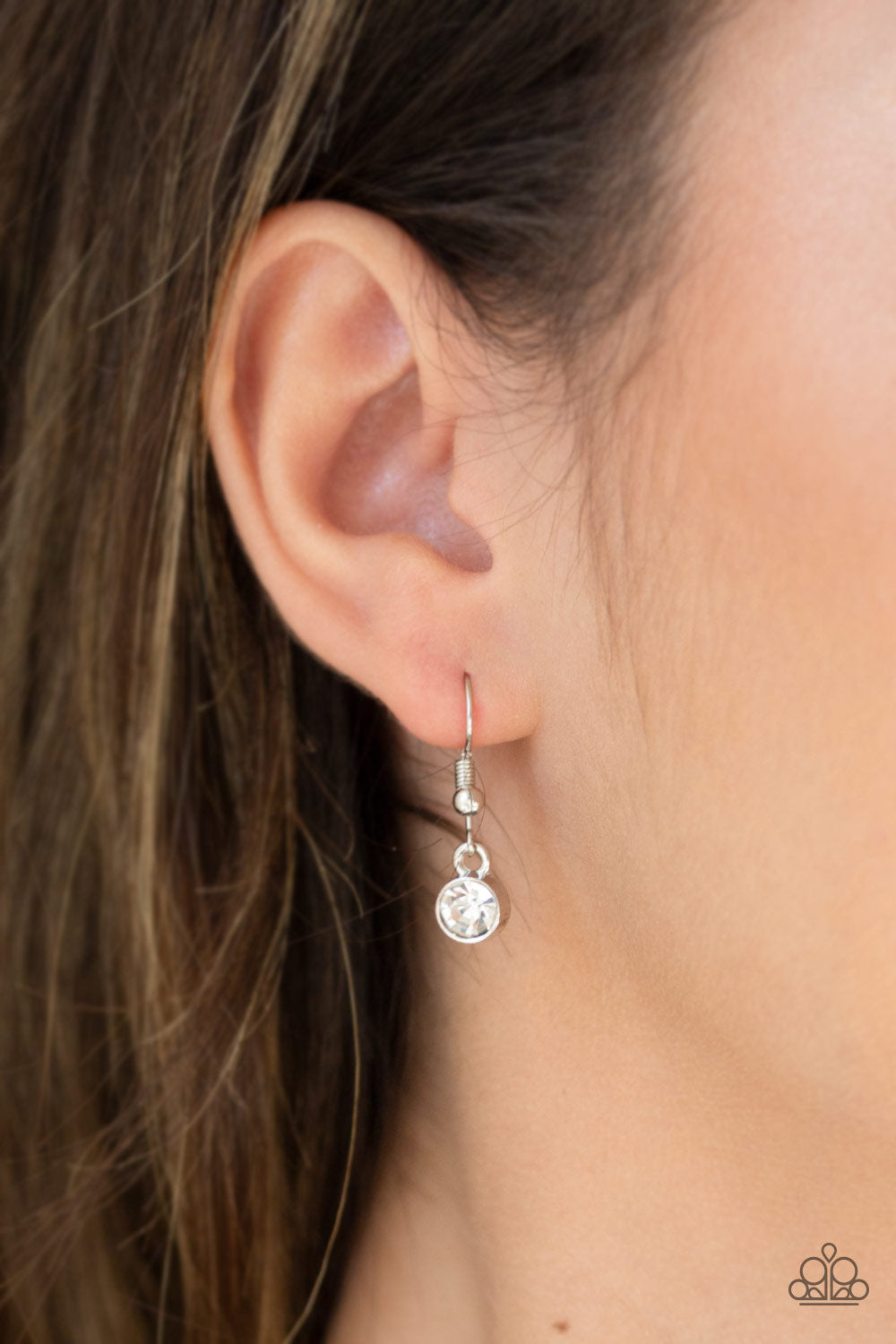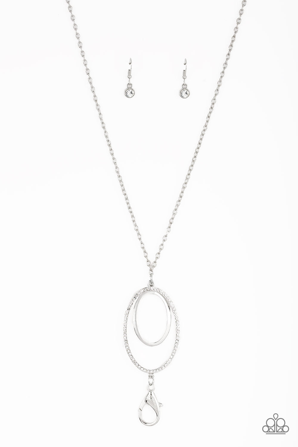 Swinging from the bottom of a lengthened silver chain, a shiny silver hoop swings from the top of a white rhinestone encrusted hoop, creating a refined pendant. A lobster clasp hangs from the bottom of the design to allow a name badge or other item to be attached. Features an adjustable clasp closure.