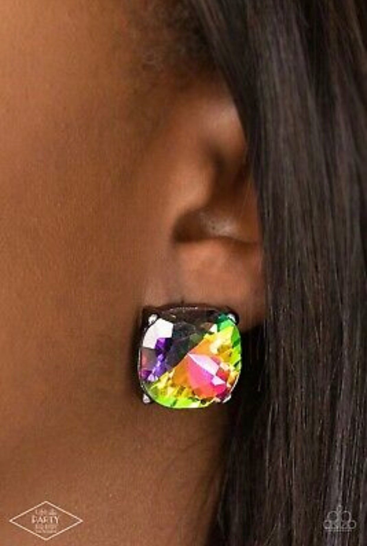 A dramatically oversized oil spill gem is nestled atop a pronged gunmetal frame, creating a jaw-dropping dazzle. Earring attaches to a standard post fitting.