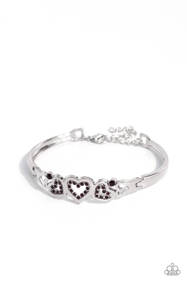 A whimsical arrangement of mismatched silver heart frames playfully intertwines to create an enchanting centerpiece, gracefully connecting to two elegantly curved silver frames, forming a stylish cuff bracelet. Dazzling purple rhinestones shimmer within the central hearts, infusing the design with a touch of romance and sparkle. The bracelet is complemented by an adjustable clasp closure for a perfect fit.