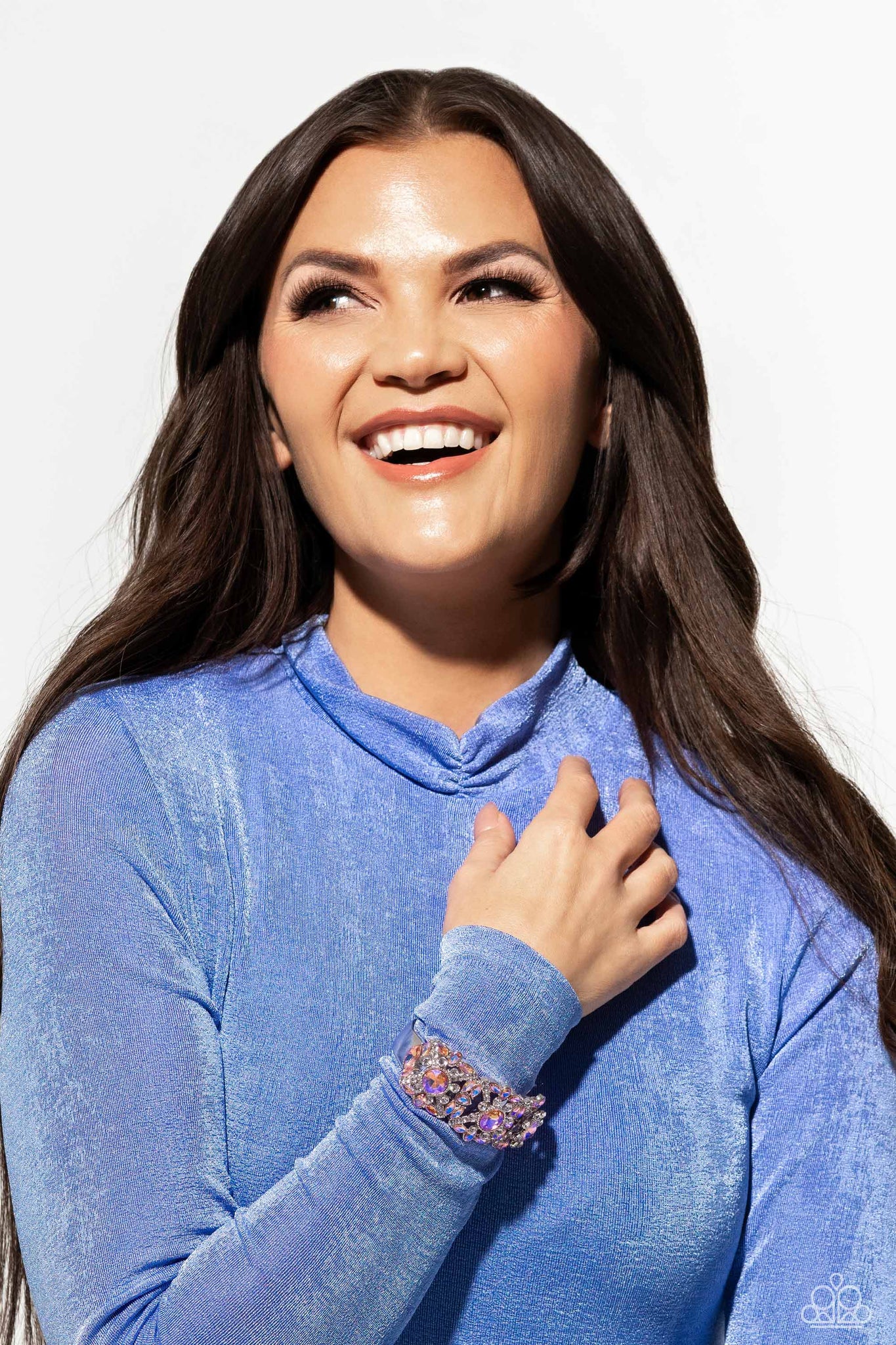 Various orange and white rhinestones in round, teardrop, and marquise cuts sparkle atop airy, silver frames, connected to a silver bangle-like bracelet around the wrist for a jaw-dropping dazzle. Features a hinged closure.