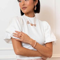 Modeled after a sand dollar motif, an explosion of marquise-cut peach gems and round white and iridescent rhinestones rest atop a shimmery rose gold disc accented with shimmery Tender Peach marquise-cut beads. Pronged in rose gold fittings, a refined display of peachy, champagne, white, and iridescent gems and rhinestones in round and marquise cuts fan out in a clustered display beside the rose gold center, creating a spectacular centerpiece. Features an adjustable clasp closure. Due to its prismatic palette, color may vary.