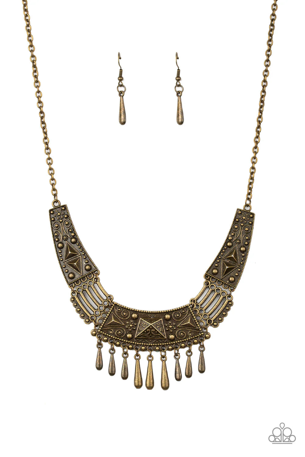 Embossed and studded in tribal inspired details, glistening brass plates connect below the collar in a fierce fashion. Dainty teardrop brass beads drip from the center of the pendant, creating a delicate fringe. Features an adjustable clasp closure.