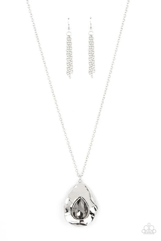 A warped silver frame gently folds around an oversized smoky teardrop gem center, resulting in a gritty yet glamorous pendant at the bottom of a lengthened silver chain. Features an adjustable clasp closure.