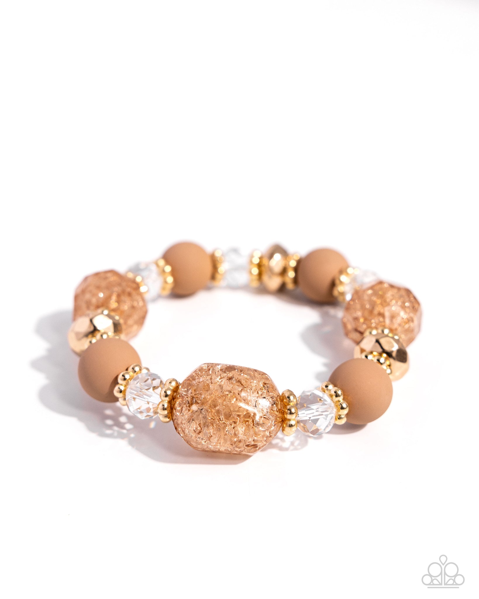 Faceted and floral gold beads combine with a collection of Brush solid, cloudy, and crackle beads in varying sizes, to create a modern design threaded along an elastic stretchy band. Faceted clear beaded accents are interspersed along the design for an additional hint of refinement.