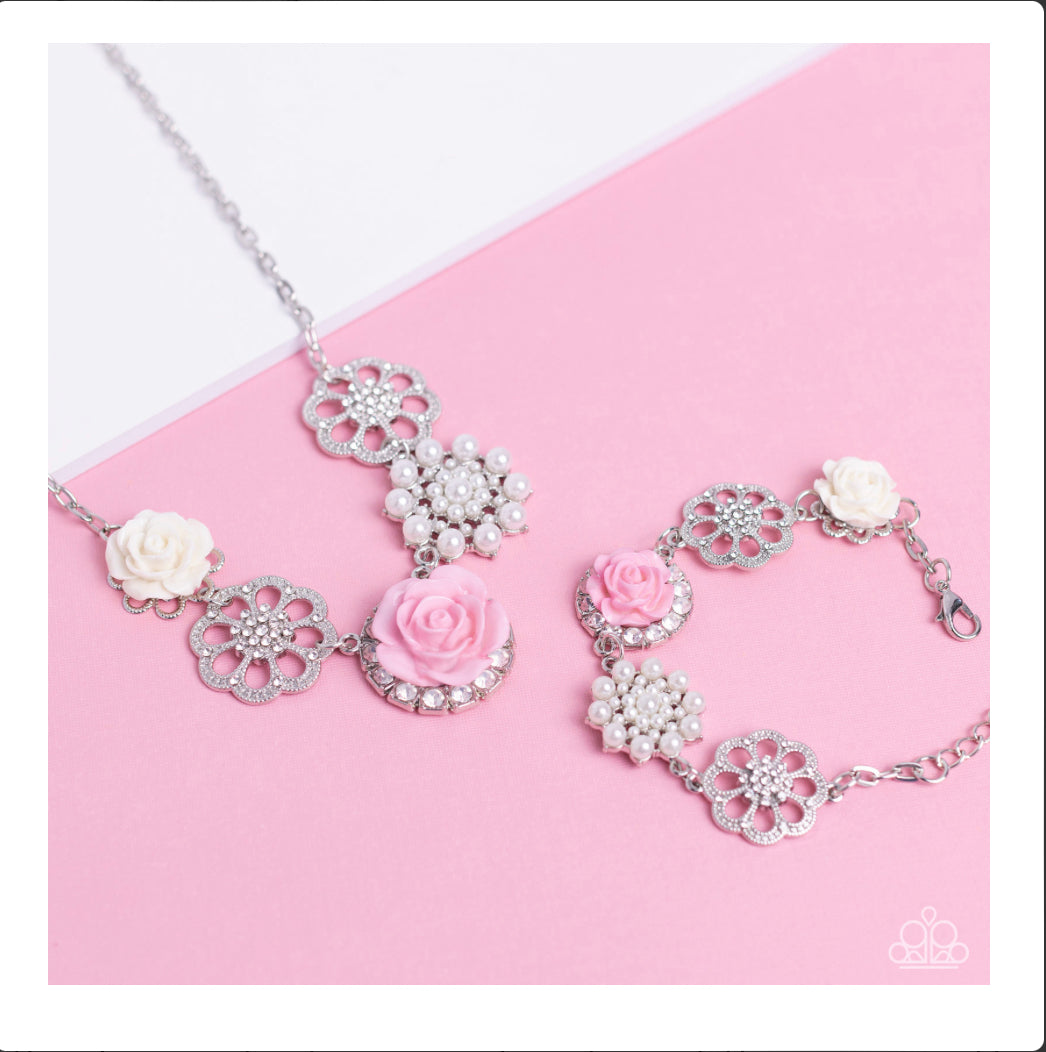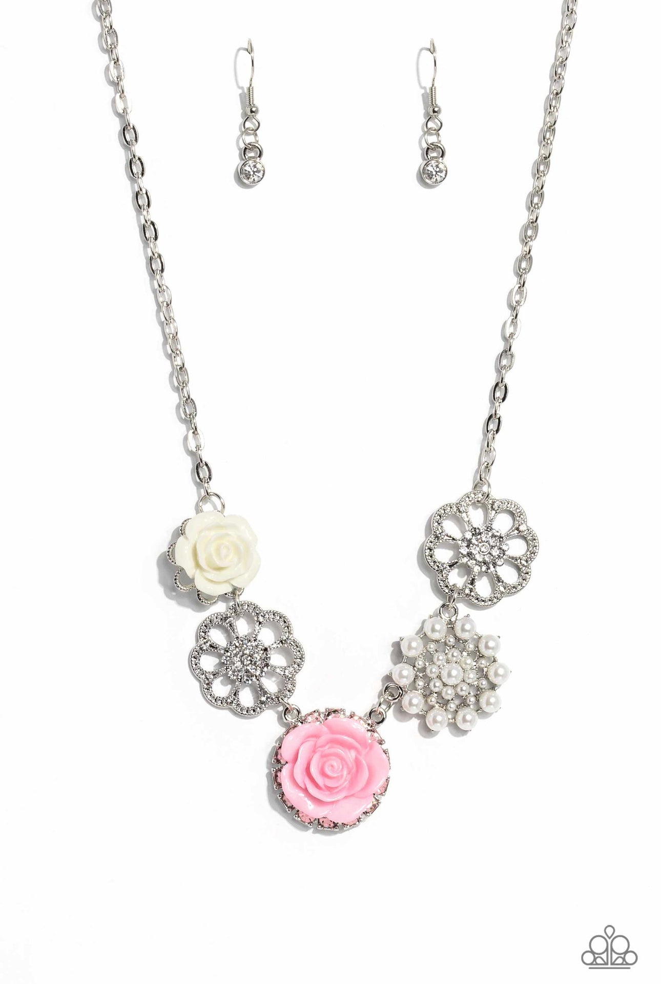 A collection of whimsical, refined flowers gathers along a flat, sleek silver link chain. The featured charms include an ivory resin rose blooming atop a glittery silver floral silhouette, two silver flowers dusted with dainty white rhinestones and studs around its petals and centers, a baby pink resin rose blooming atop a fan of white gems, and a pearl-petaled and centered flower creating a floral fantasy around the collar. Features an adjustable clasp closure.