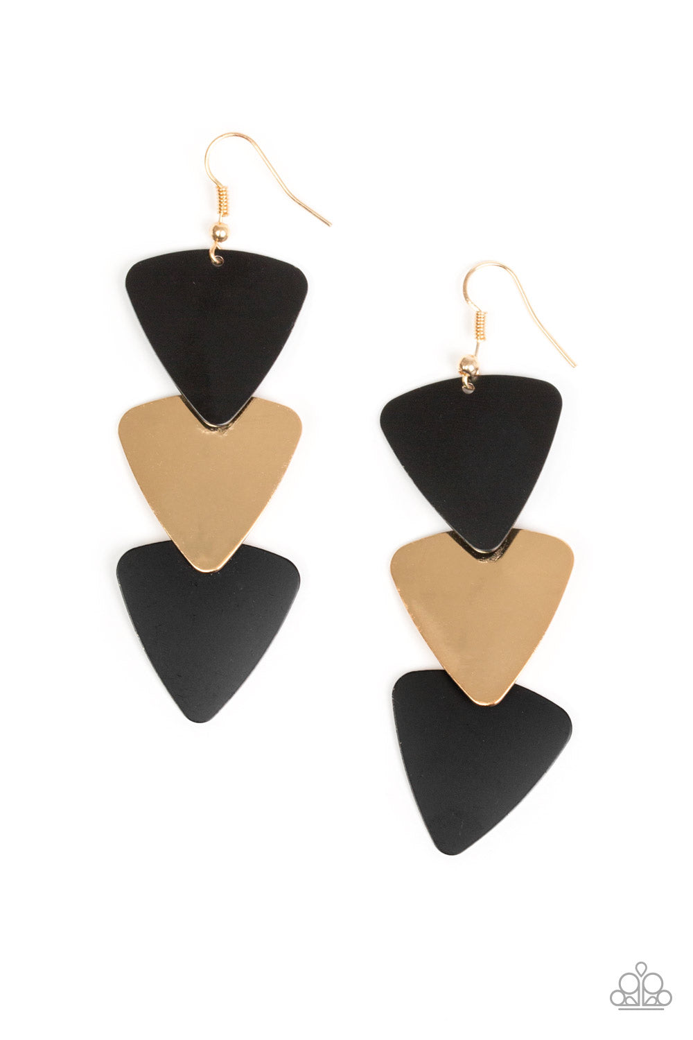 Brushed in a high-sheen shimmer, glistening black and gold triangular frames cascade from the ear, creating an edgy lure. Earring attaches to a standard fishhook fitting.