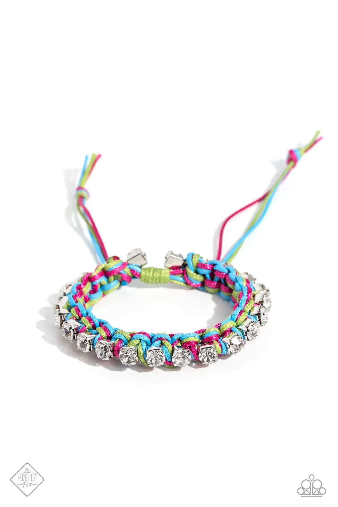 Strands of pink, blue, and green cording ornately weave across the wrist, creating an earthy braid. Sporadically dotted through the cording, white rhinestones, set in silversquare fittings add a bit of lively dazzle to the colorful design. Features an adjustable sliding knot closure.