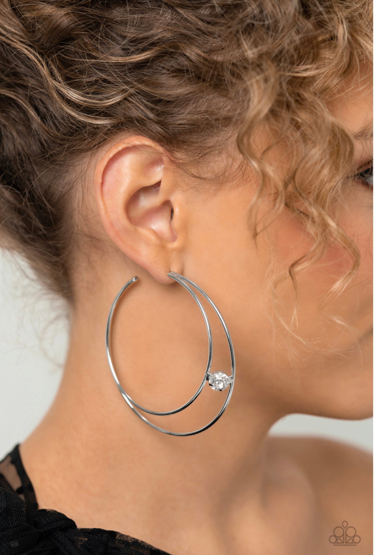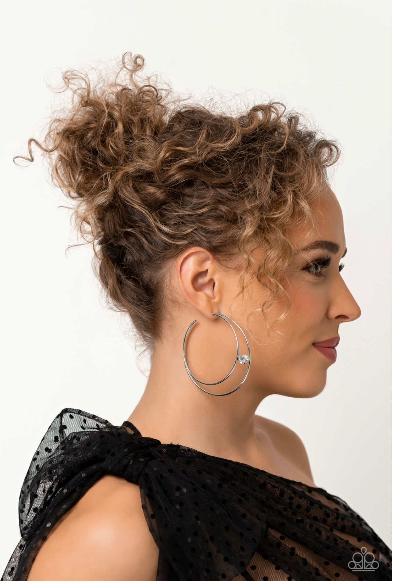 Lodged between two dainty silver crescent frames that curve into double hoops, a faceted white rhinestone rests for a delicate shimmer near the ear. Earring attaches to a standard post fitting. Hoop measures approximately 2" in diameter.