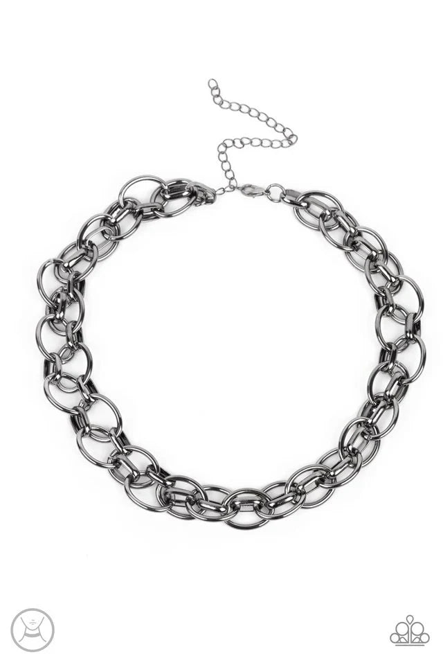 An oversized gunmetal chain interlocks with an oval linked chain, resulting in a rebellious fashion around the neck. Features an adjustable clasp closure.