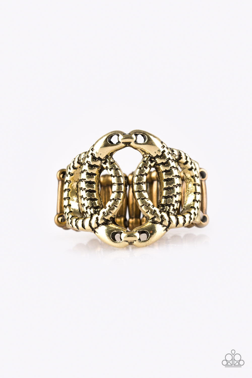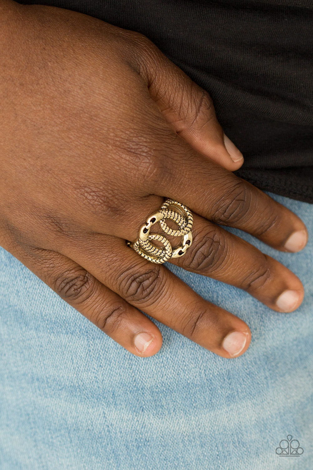 Etched in edgy asymmetrical textures, three glistening brass rings link across the finger, creating a bold industrial centerpiece. Features a stretchy band for a flexible fit.