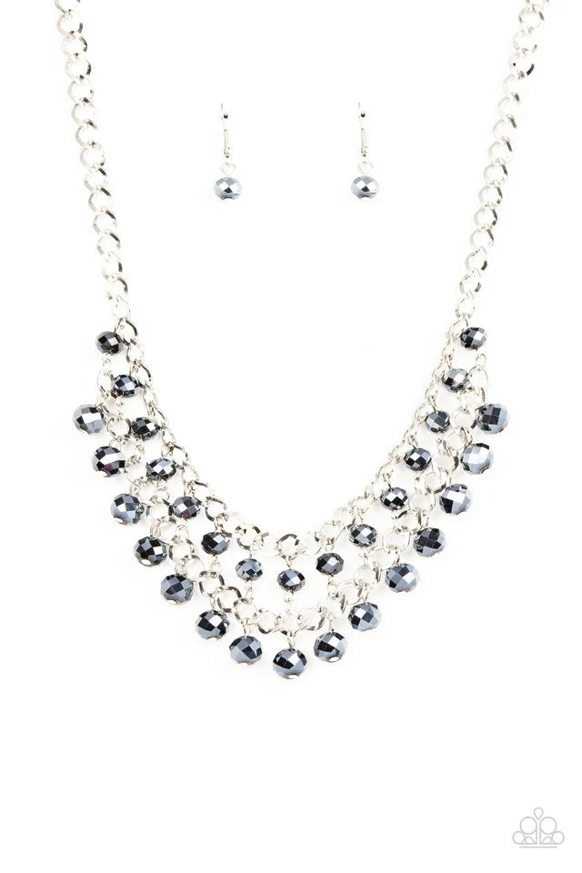 Featuring metallic iridescence, two rows of flashy blue crystal-like beads cascade from the bottom of two interlocking silver chains, resulting in a radiant fringe below the collar. Features an adjustable clasp closure