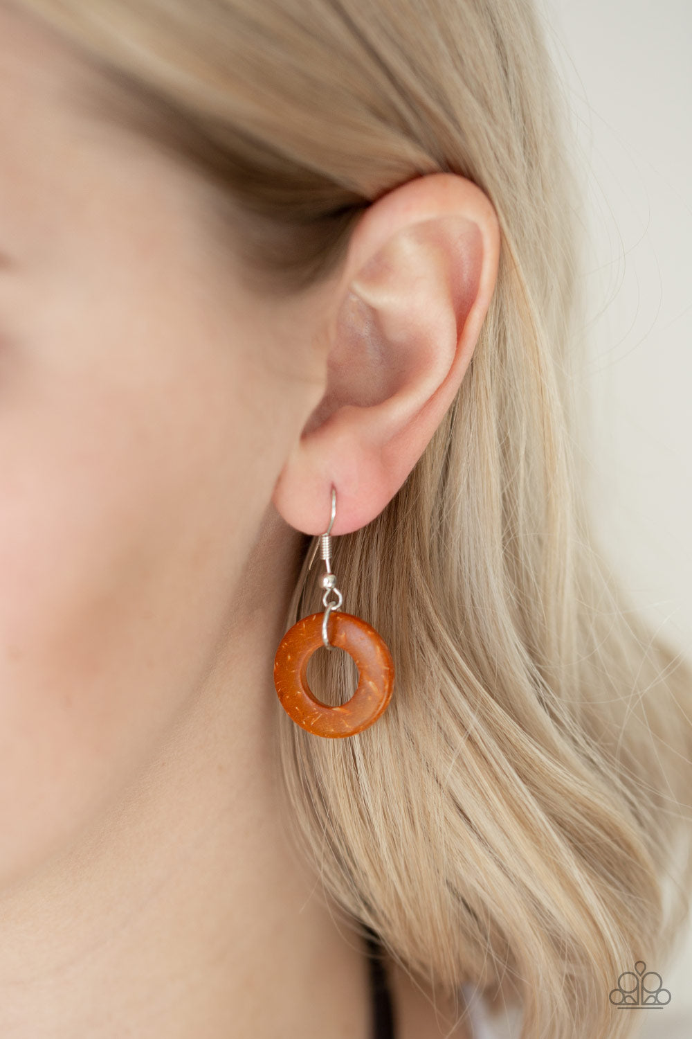 Shiny brown cording knots around mismatched orange wooden beads, creating vivacious layers. Features a button loop closure.